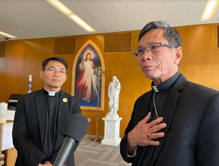 Giám Mục Nguyễn Thái Thành (phải), Giám Mục Phụ Tá Giáo Phận Orange, và Linh Mục Thái Quốc Bảo, viện trưởng (rector) nhà thờ Chính Tòa Chúa Kitô, trưởng ban tổ chức Đại Hội Thánh Mẫu, trả lời báo giới tại cuộc họp báo.