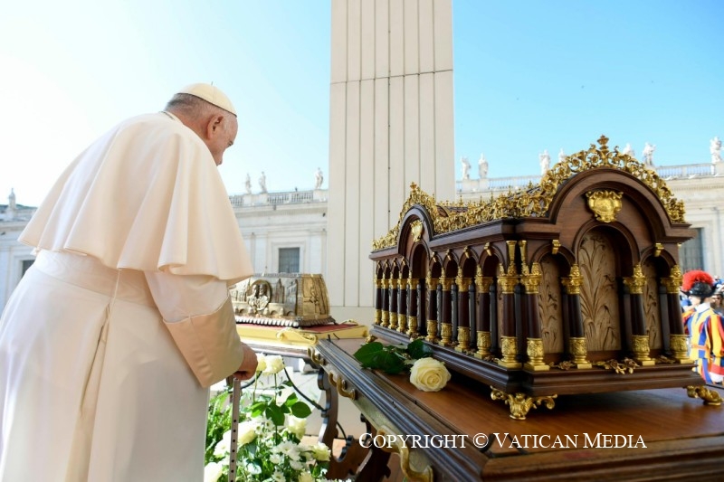 Trước mặt chúng ta đây là thánh tích của Thánh Têrêsa Hài Đồng Giêsu, bổn mạng các xứ truyền giáo. Thật tốt khi điều này xảy ra trong khi chúng ta đang suy tư về niềm đam mê rao giảng Tin Mừng, về lòng nhiệt thành tông đồ. Vậy thì hôm nay, chúng ta hãy để chứng tá của Thánh Têrêsa giúp chúng ta. Ngài đã sinh ra cách đây 150 năm, và tôi dự định sẽ dành một Tông thư cho ngài vào ngày kỷ niệm này.